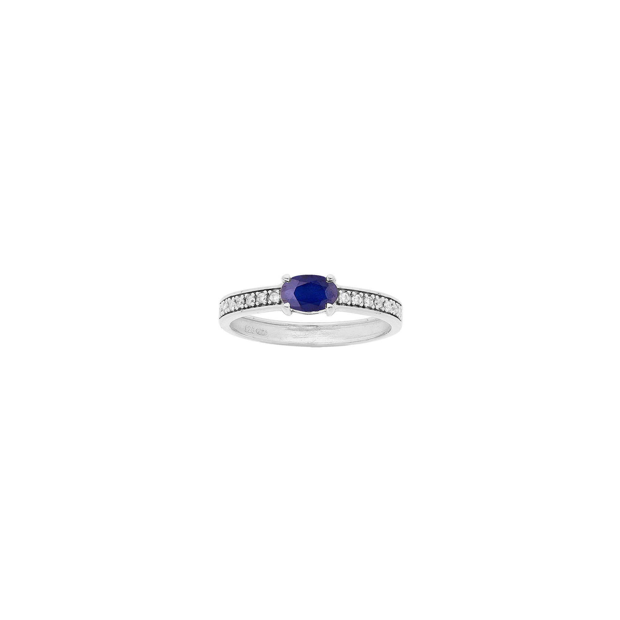 Bague en argent rhodié, saphir et topazes blanches, taille 54