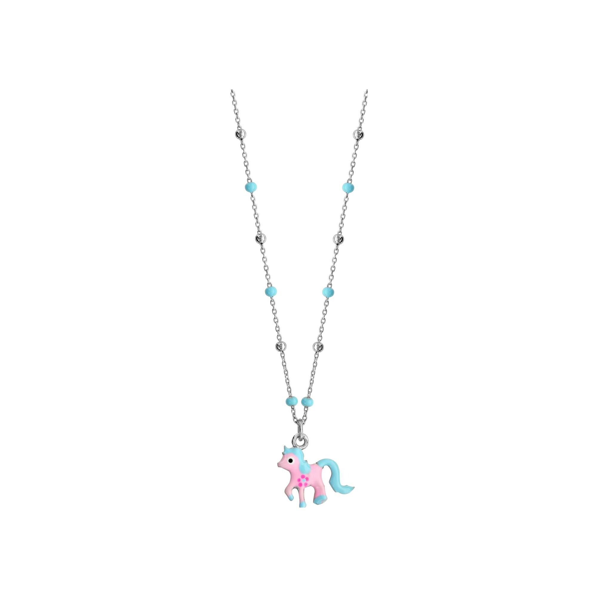 Collier argent rhodié pendentif poney rose et bleu 36+3cm