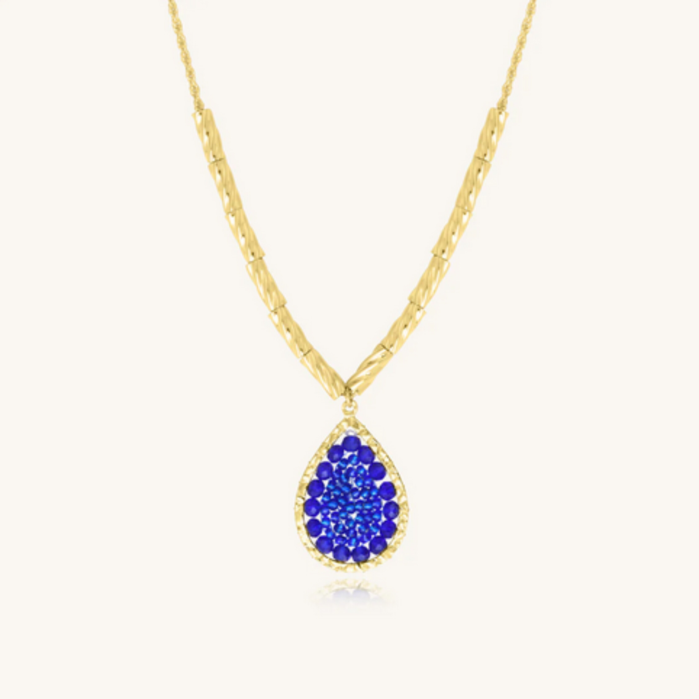 Collier acier doré et pendentif goutte en perles bleues