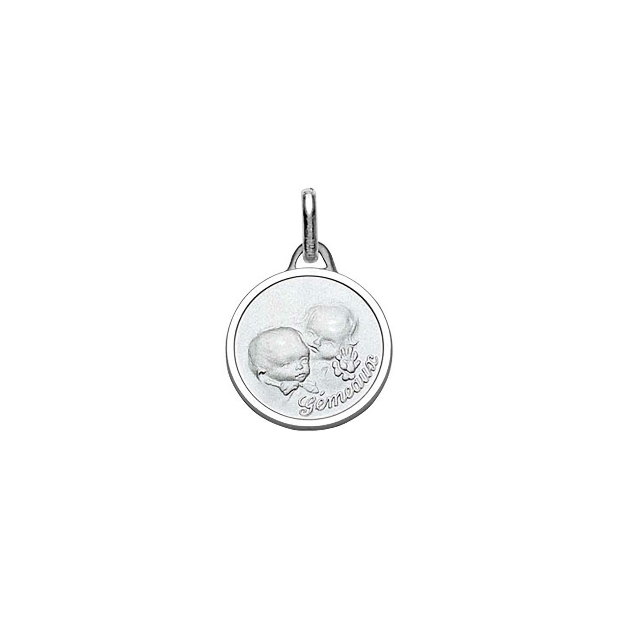 Médaille ronde zodiaque gémeaux pour bébé en argent rhodié